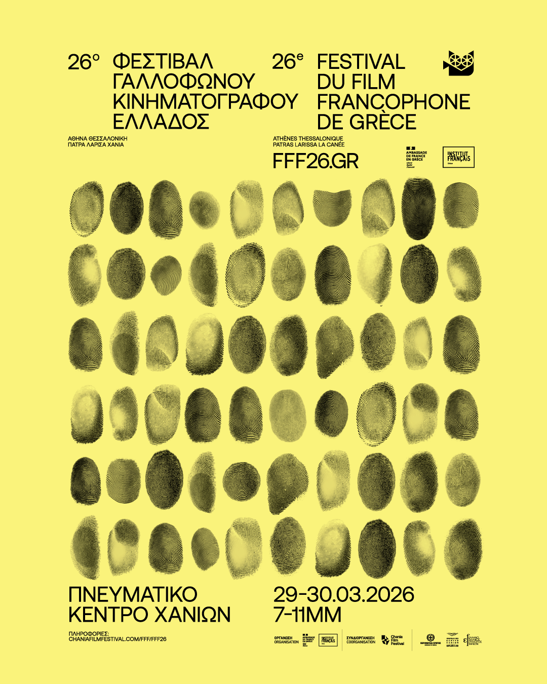 29 και 30 Μαρτίου 2026 στα Χανιά το 26ο Φεστιβάλ Γαλλόφωνου Κινηματογράφου Ελλάδος από το CFF Το Φεστιβάλ Γαλλόφωνου Κινηματογράφου Ελλάδος θα πραγματοποιήσει την 26η διοργάνωσή του στις αίθουσες Αθήνας, Θεσσαλονίκης, Πάτρας, Λάρισας και Χανίων. Στα Χανιά σε συνδιοργάνωση με το Φεστιβάλ Κινηματογράφου Χανιών και την υποστήριξη της Περιφέρειας Κρήτης και του Ελληνογαλλικού Συλλόγου Χανίων,