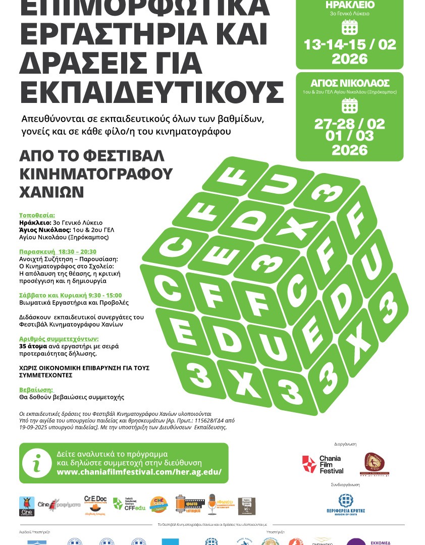 Το Φεστιβάλ Κινηματογράφου Χανίων σε συνδιοργάνωση με την Περιφέρεια Κρήτης και τις διευθύνσεις εκπαίδευσης υπό την αιγίδα του υπουργείου παιδείας και θρησκευμάτων [Αρ. Πρωτ.: 115628/ΓΔ4 από 19-09-2025 υπουργού παιδείας] διοργανώνουν τριήμερα με επιμορφωτικά εργαστήρια και δράσεις για τον κινηματογράφο για εκπαιδευτικούς (όλων των βαθμίδων), γονείς και κάθε φίλο/η του κινηματογράφου σε Ηράκλειο και Άγιο Νικόλαο.